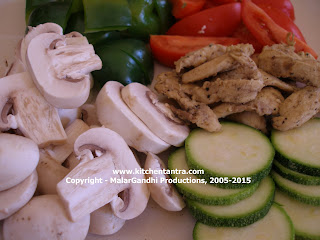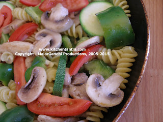Sometimes salad itself can be a filling meal! On a hectic day…I try to balace my salad with carbohydrate(Omega 3 enriched pasta), vegetables, both animal protein(chicken) & plant protein (mushrooms). Thats all here you go simple and complete planned food!
