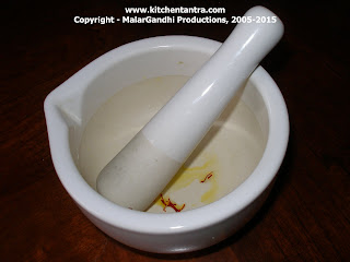 In a heavy-bottomed, non-stick, deep vessel. Heat milk, along with sugar syrup, saffron and cardamon seeds.