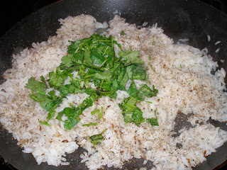 Heat oil in a wide skillet. Add cumin seeds and followed by rice…stir fry for couple of minutes.