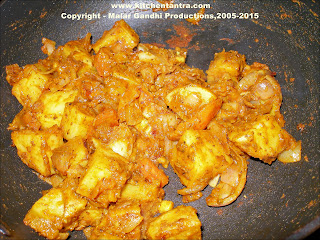 Add toamtoes, salt and all the powdered spices to it. Add potatoes and cook briefly.