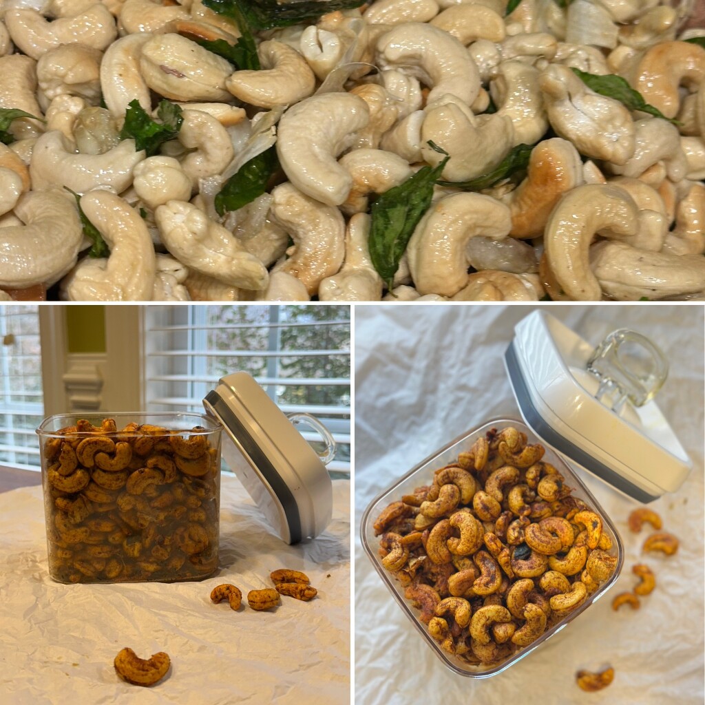 Never been a fan of roasted nuts! But, on the other day…felt like having something spicy! I have this never-opened pack of cashews lying around for months! So, planned to put that into good use! The recipe is quite simple. It’s completely Desi way. Added few generous portion of ghee to the pan. Tossed the nuts to it. Waiting until it’s bit golden. Then, added salt, chili, turmeric, crushed garlic and curry leaves. Once they turn aromatic. It’s done. I let that sit for a while in a tray and stored them in a canister for later use! Well, there was no later use though! Everyone munched it right away.