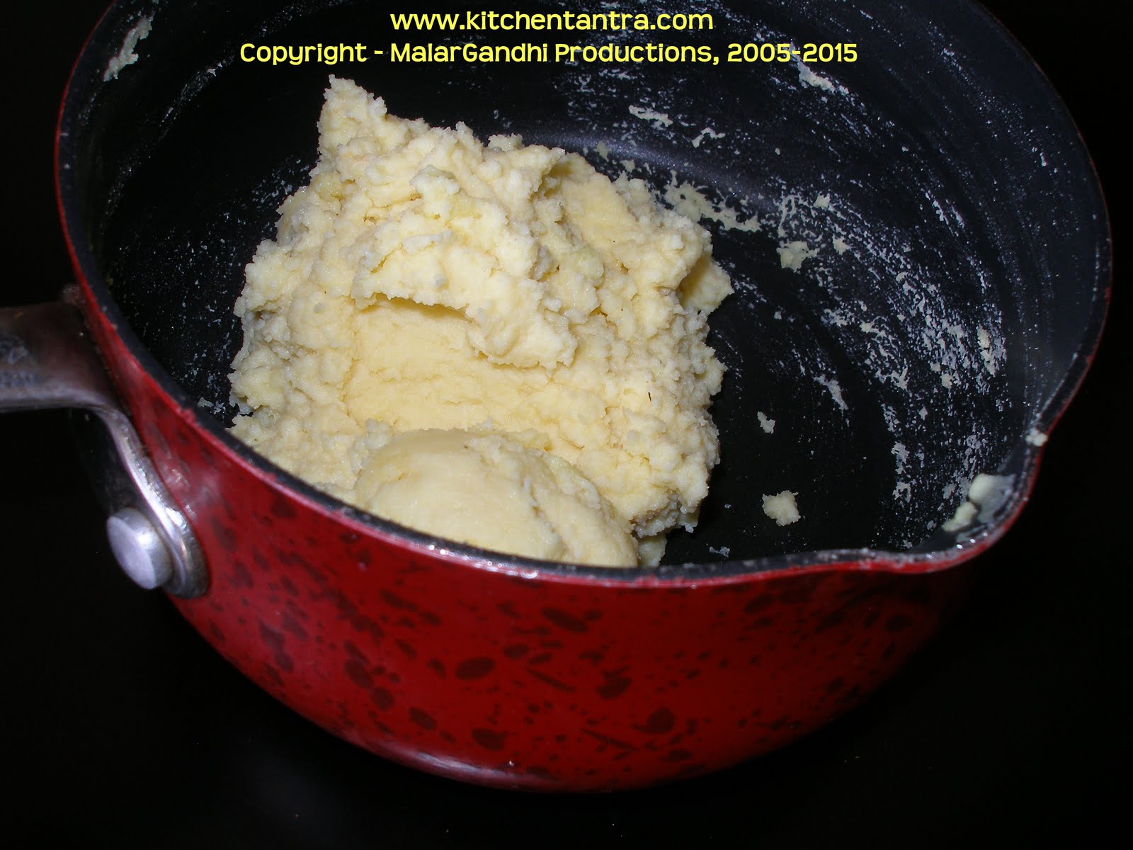Squeeze out the excess water. Add sugar and saffron. Put them in a non-stick pan and remove the excess moisture slowly. Once its throws up to a fine mass, remove from heat and shape them in desired way.