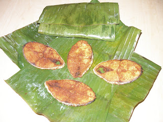 Actually its a bake/steam cooking recipe! But my brother insisted on frying them….as he liked the idea of plantain leaves giving a smoky odour to your fish. Well…we both were experimenting in my Mom’s kitchen(back home). We steamed the fish first(well-wrapped in plantain leaves) and saved it for calorie counters! And to tell you that….thats the end of actual recipe! But we took over from here….we fried the same for quick few seconds in oil…to get a crispy outlayers! Nice one, right!