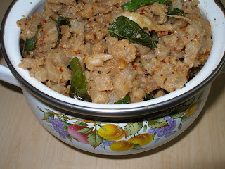 When the vegetable is half the way done, add grated peanuts and chilies, stir fry over medium to high heat. Maybe till they are really fried and fragrant.
