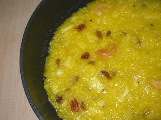 Now heat ghee in a wide non-stick pan. Fry cashews and followed by raisins. To the same oil add saffron and cardamom too.