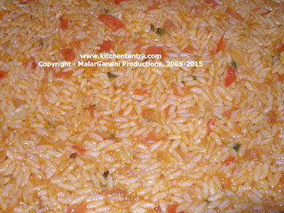 If you don’t find unpolished rice or fan of wild rice…at least switch to parboiled rice, which is enriched in vitamins.(Par boiled rice is something…paddy seeds are boiled along with husk, so that vitamins from the husk gets seeped into the rice. Then they dry it, later husk it). So the rice is bit extra large than the raw rice & also has an yellowish tint, don’t worry for the color! Well…rice has wonderful kushboo when it is cooked, I love it. Suit well for this Spanish rice.