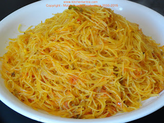 Then, add tomato juice, salt, turmeric and chili powder. Once the oil shows up on the sides…stir-in the rice noodles. Stir-fry over high briefly and remove from heat.