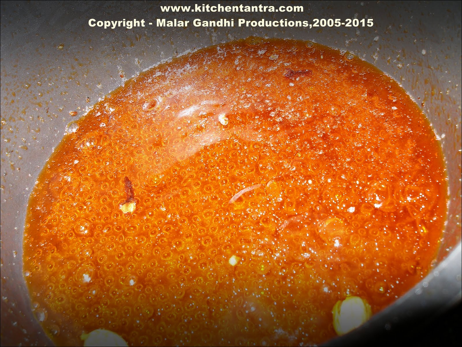 In the same oil…add sugar solution, add the spices…continue boiling.